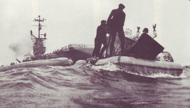 86k | USS Wasp (CVS-18) approaches the [Gemini 9] spacecraft of Astronauts Thomas P. Stafford and Eugene A. Cernan [, 6 June 1966, ] after their three-day space mission. Frogmen, flown to the floating capsule by helicopter, have already attached flotation collars to the capsule (NASA photo). Photo and text from "Aircraft Carriers," by Norman Polmar. |