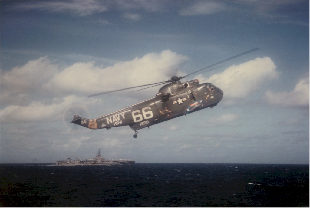 106k | Sikorsky SH-3A Sea King modex AS66 (BuNo 151556), assigned to HS-11 "Sub Seekers." As of mid-2008, this helo was at the American Helicopter Museum, West Chester, Pa. USS Wasp (CVS-18) and USS Forrest Sherman (DD-931) refuel from USS Severn (AO-61), in the background. Photo taken on 8 December 1966. |