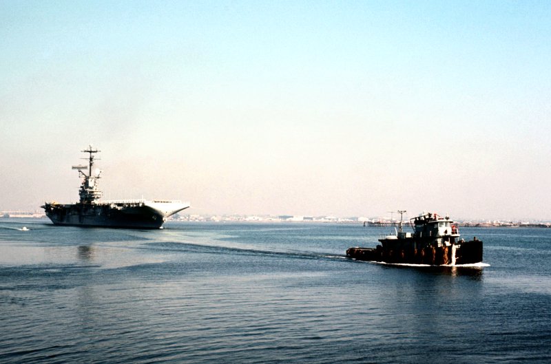 66k | Wawasee (YTM-367) and USS Wasp (CVS-18) underway in Boston Harbor, 7 September 1964. |