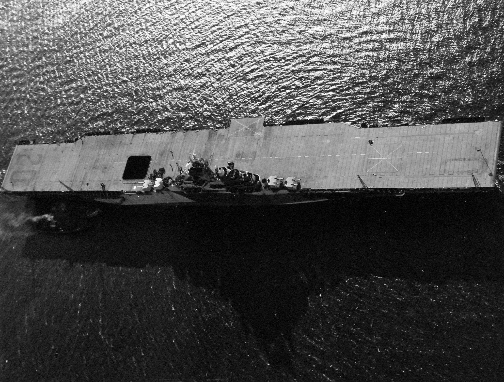 620k | As above. This photo does show her flight deck stained blue, with dull black numerals and dash lines. Note there are no elevator outlines. The inside screens of the lift shaft are painted black. Note that the 5"/38 single mounts and some of the 40-mm quads were at times surrounded by rails instead of splinter shields, in order to save weight, but this was a temporary measure. (Thanks to Robert Hurst, who provided additional info). National Archives and Records Administration (NARA) photo, # 80-G-298092. |