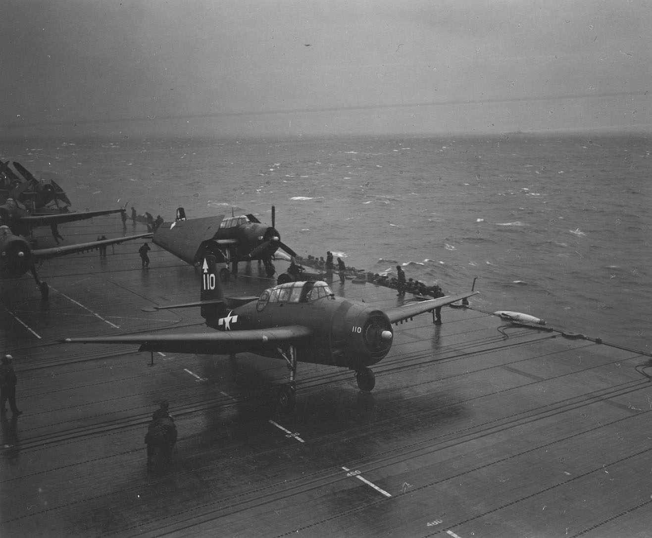 129k | TBM-3 Avenger from VT-82 deck-launching from Bennington in a rain squall, February 1945. Photo now in the collections of the US National Archives and Records Administration, #80-G-305181. |
