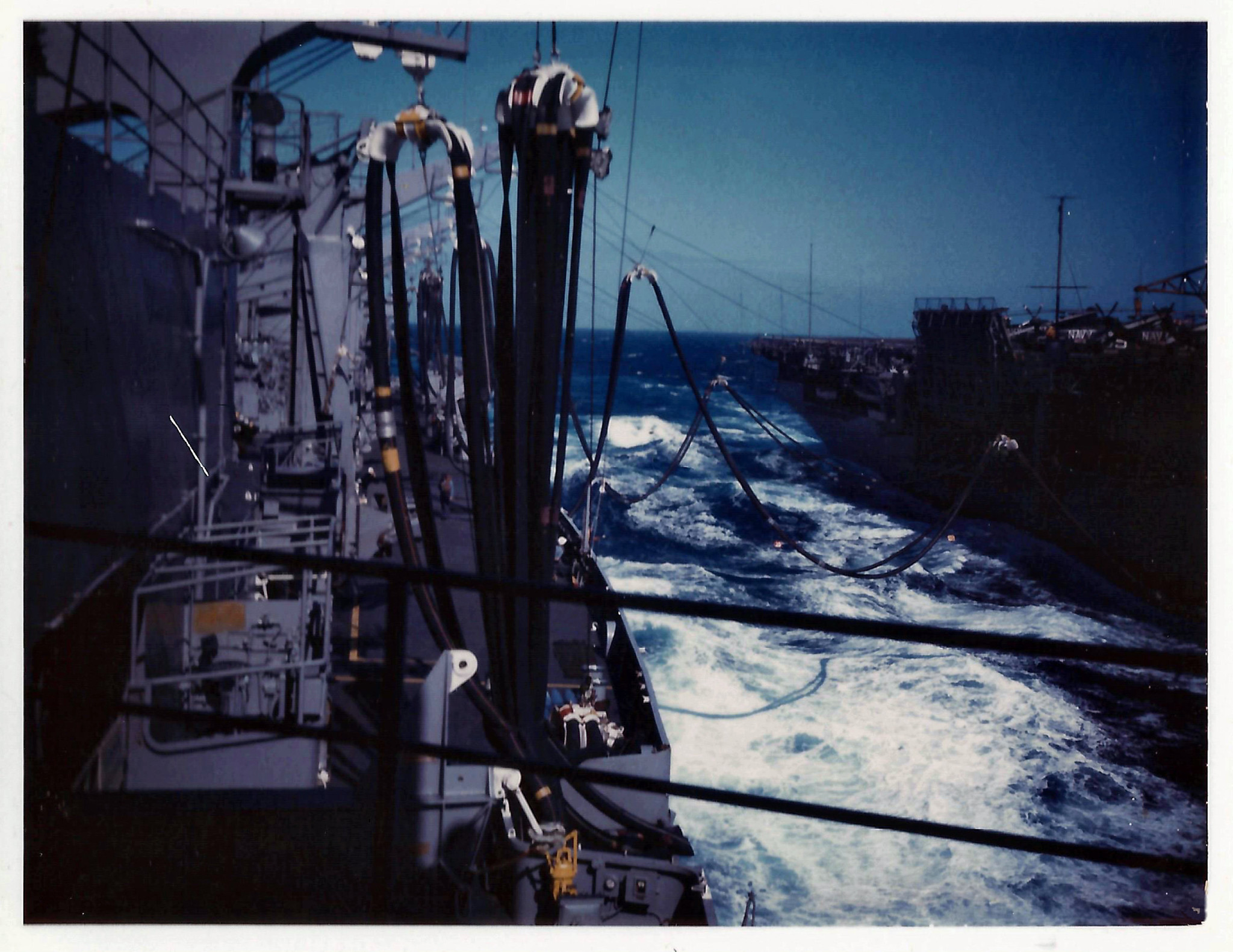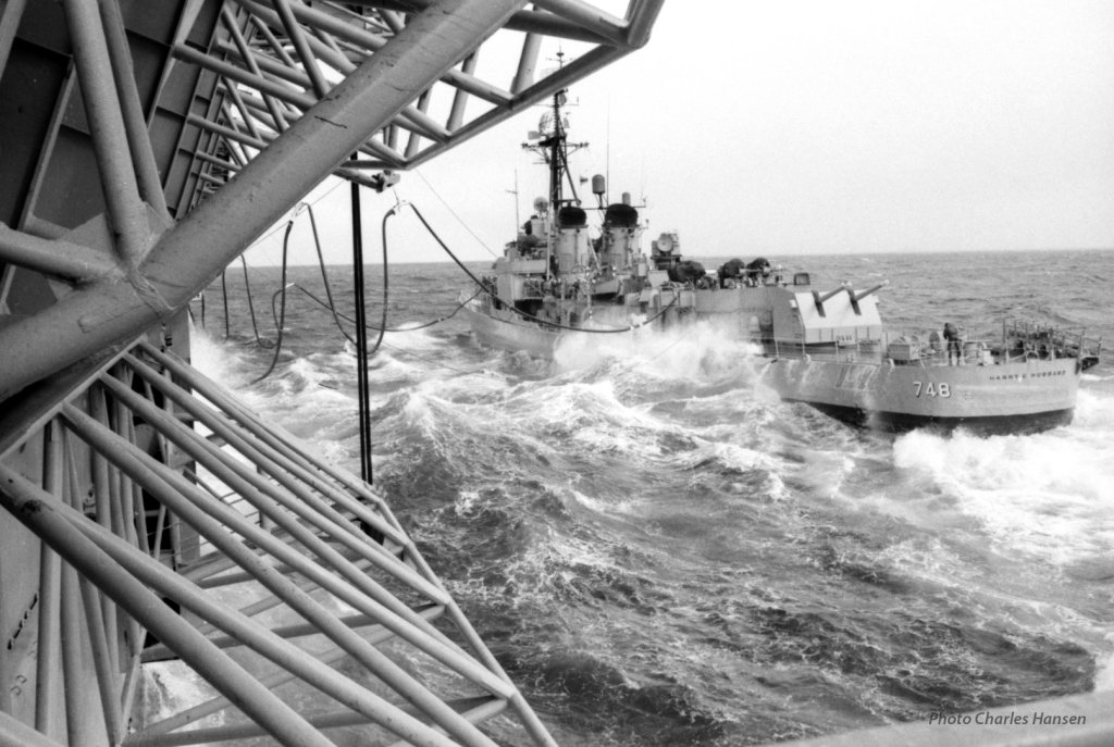 284k | USS Mauna Kea (AE-22) highlines ammunition to the aircraft carrier USS Bennington (CVS-20) in the Gulf of Tonkin, 10 September 1968. Bennington, with assigned Anti-Submarine Carrier Air Group (CVSG) 59, was deployed to the Western Pacific and Vietnam from 30 April to 9 November 1968. US Navy photo # USN 1137061 by PH1 Garrison, U.S. Navy. |