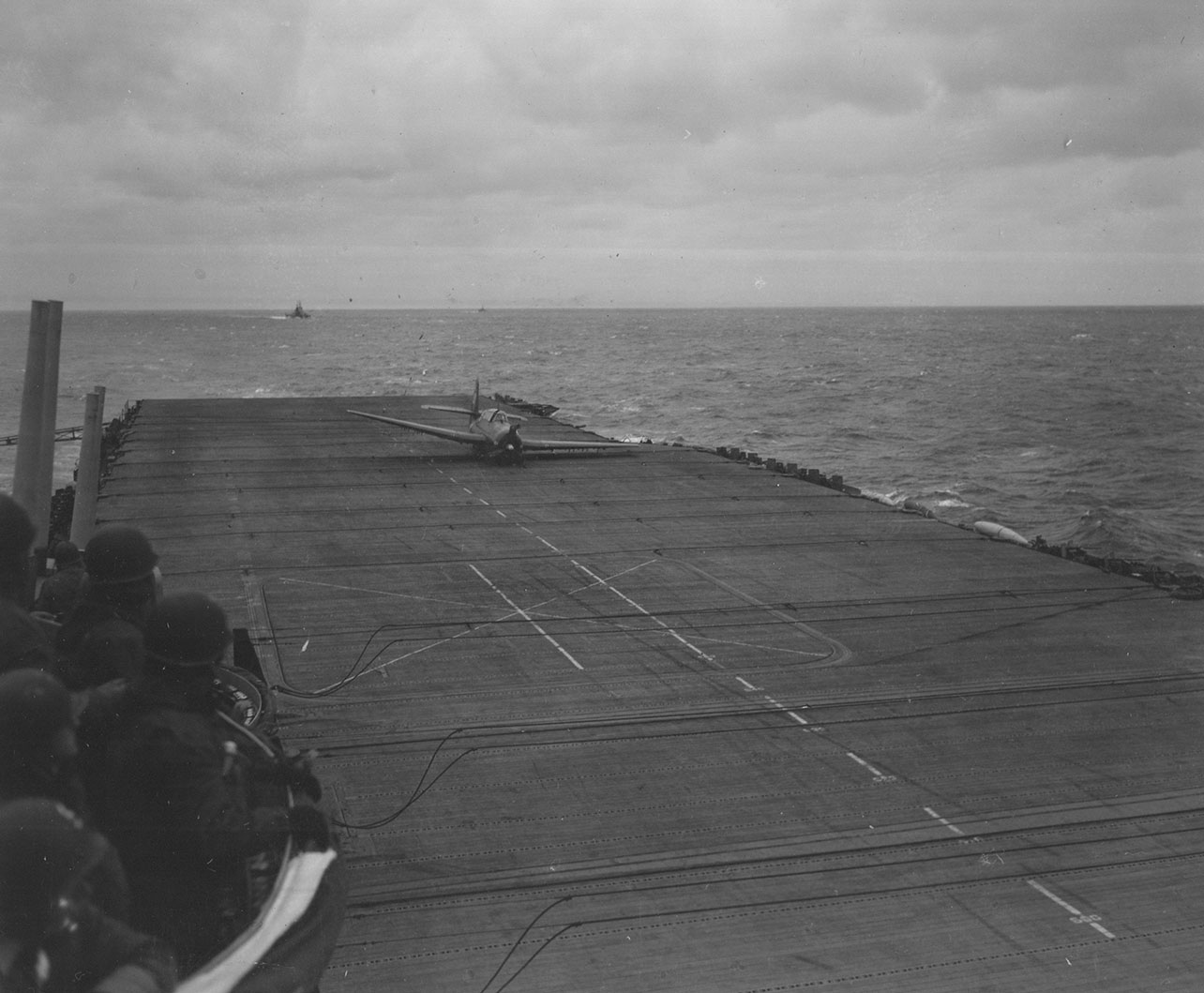169k | VT-82 TBM-3 Avenger #101 makes a gear-up landing on 16 February 1945, after receiving battle damage during a raid over Tokyo, Japan. The plane was so badly damaged that it was pushed overboard; one of eleven lost that day. Note the empty drop tanks on the port catwalk ready for re-arming and re-fueling of the air group for the next strike. US Navy Photo, now in the custody of the US National Archives at College Park, Maryland (80-G-305176). |