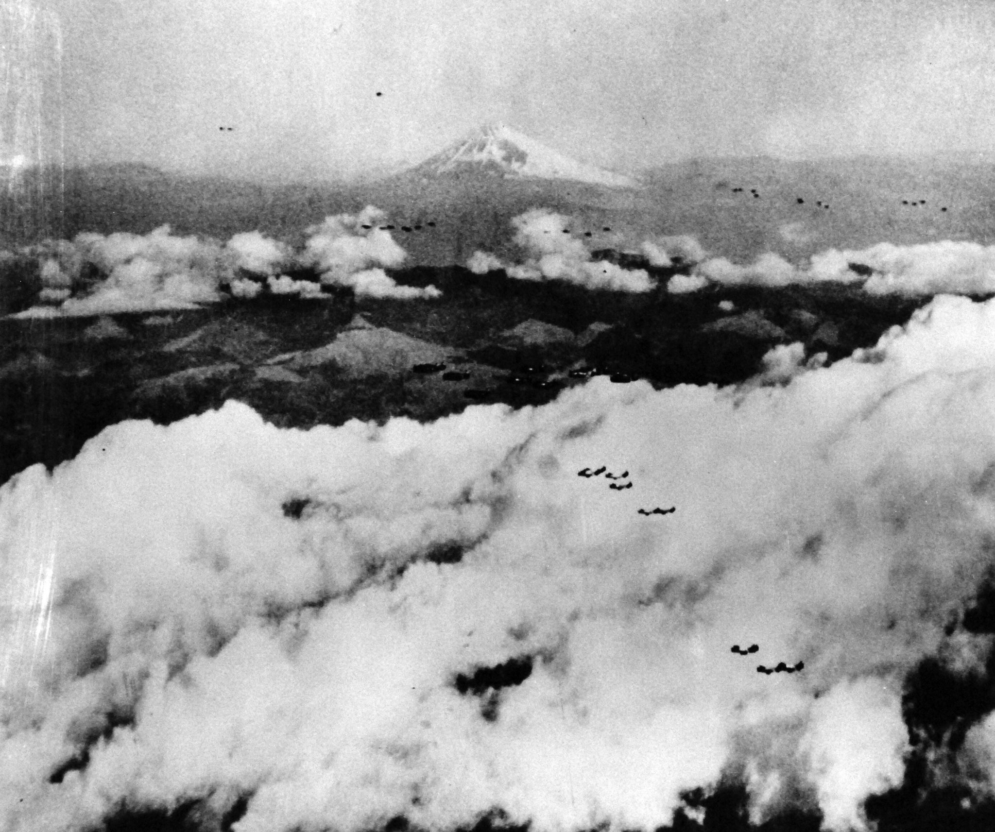 517k | Planes from USS Bennington (CV-20) flying over Tokyo, Japan, 16 February 1945. Mt. Fuji can be seen in the background. U.S. Navy photograph, now in the collections of the National Archives and Records Administration (NARA), # 80-G-347872. |