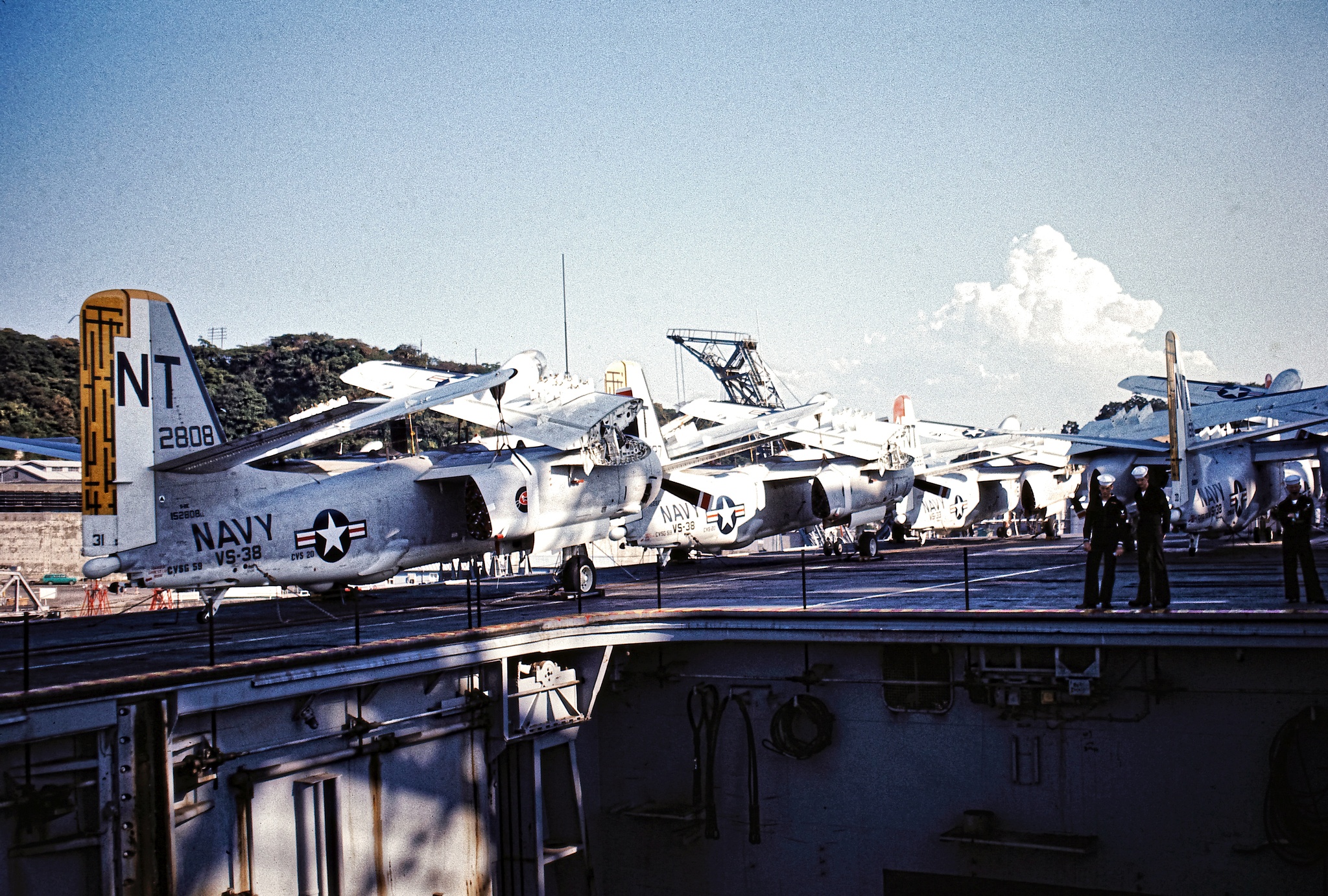 1.34M | Grumman S-2E Trackers from Antisubmarine Squadrons (VS) 38 "Red Griffins" and 33 "Screwbirds," Antisubmarine Carrier Air Group (CVSG) 59, USS Bennington (CVS-20), Yokosuka, Japan, 26–27 October 1968. Closest to camera is BuNo 152808 (modex NT31), VS-38, later upgraded to S-2G standard. The aircraft in front of it appears to be 152827 (NT30), later transferred to the Brazilian Air Force. The plane on the right of the picture may be 151684 (NT33). |