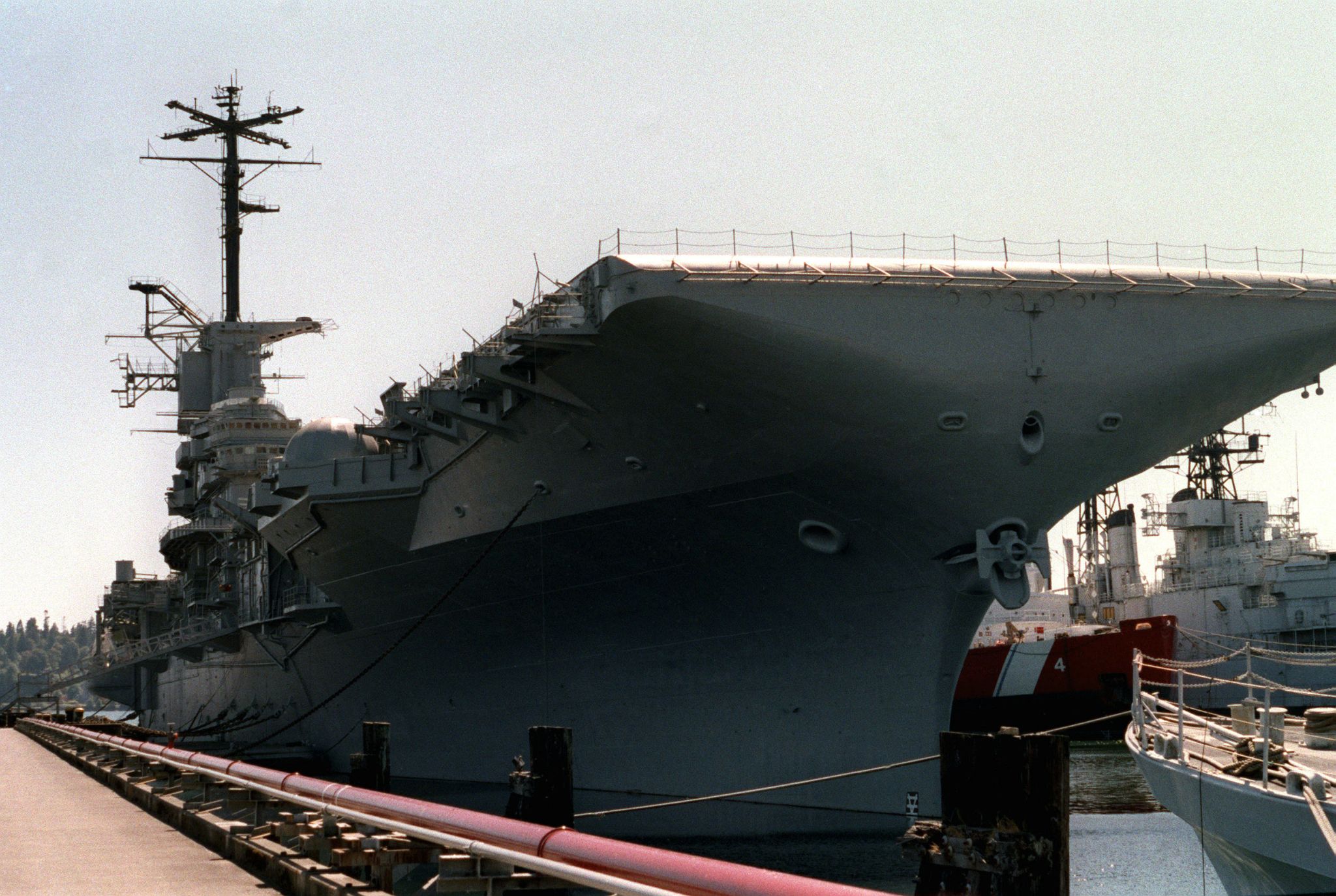 425k | Ex-USS Bennington (CVS-20) laid up at Bremerton, circa the early 1990s. Ex-USCGC Glacier (WAGB-4) and ex-USS Oklahoma City (CG-5) can be partly seen on the right side of the photo. |