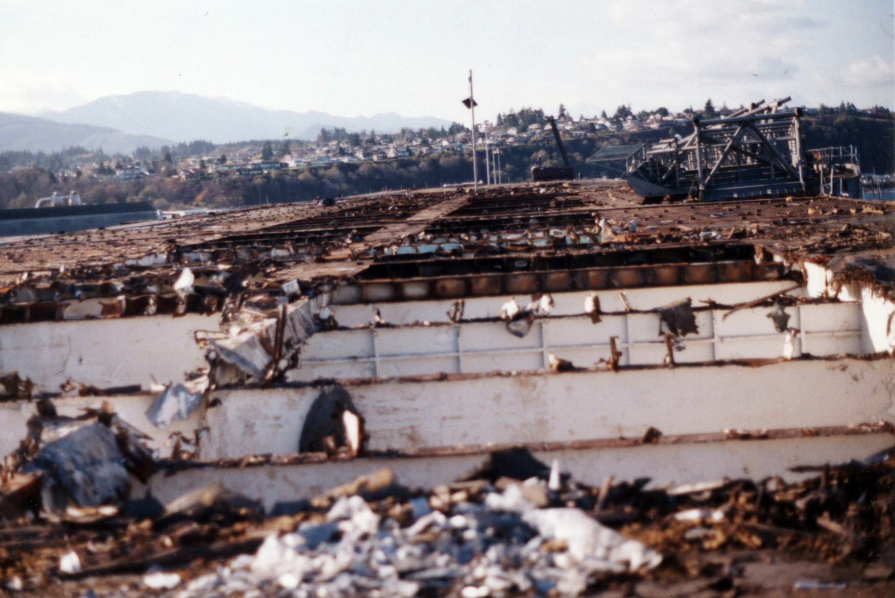 "I took the pictures when [ex-Bennington] was towed to Port Angeles, WA. From flight deck up [everything] was cut up and dropped into the Hangar Bay. Then she was towed out for scrapping." |