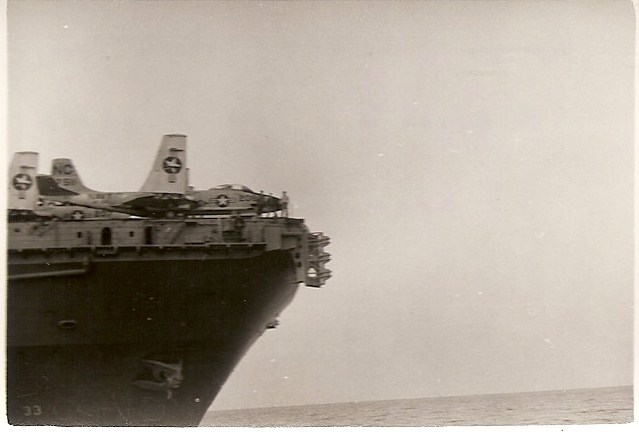 35k | Undated image of a Grumman S-2E Tracker as it comes to recover aboard the aircraft carrier USS Kearsarge (CVS-33), location unknown. Photo courtesy Mahlon K. Miller, USN. |