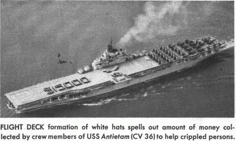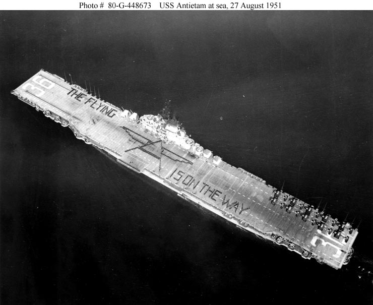 57k | USS Antietam (CV-36) at sea on 27 August 1951, shortly before deploying for Korean War duty. Crewmen are in formation on her flight deck, spelling out "The Flying =A= is on the way". Official U.S. Navy Photograph, now in the collections of the National Archives (photo # 80-G-448673). |