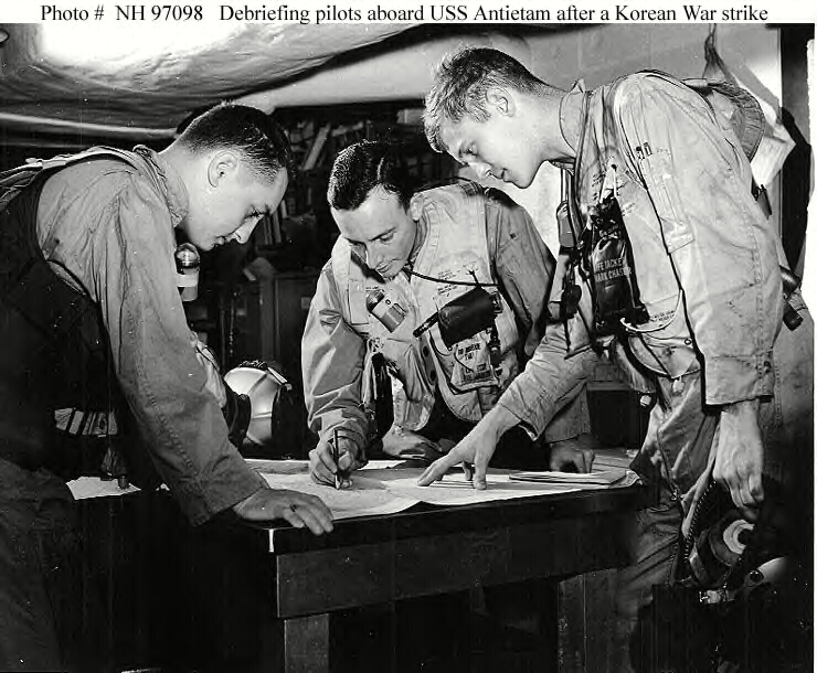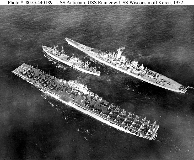 85k | USS Antietam (CV-36) alongside the stores ship USS Polaris (AF-11) and destroyer USS Hopewell (DD-681). These photos were likely taken during Antietam's only combat tour, to WestPac and Korea, Sep. 8, 1951 – May 2, 1952. Air Group was CVG-15, tail code "H." |