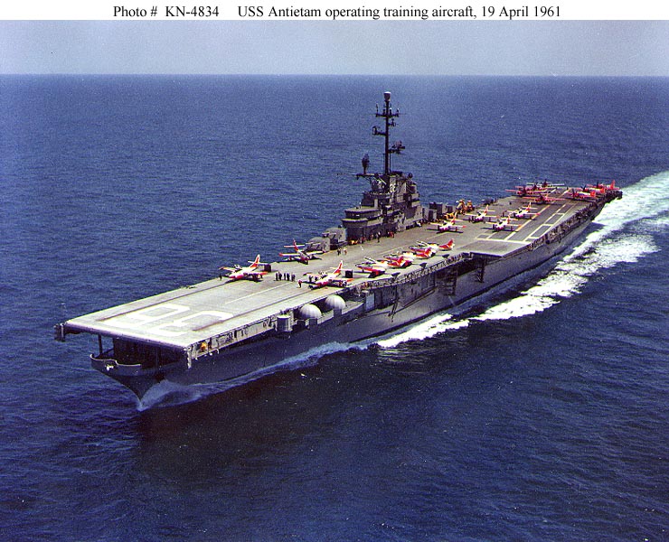129k | USS Antietam (CVS-36) operating training aircraft, 19 April 1961. Planes on deck include T2J "Buckeyes" amidships and forward and AD "Skyraiders" parked aft. Note "dayglo" paint on the aircraft and "mothballed" 5"/38 guns in the carrier's port side sponsons. Official U.S. Navy Photograph (photo # KN-4834). |