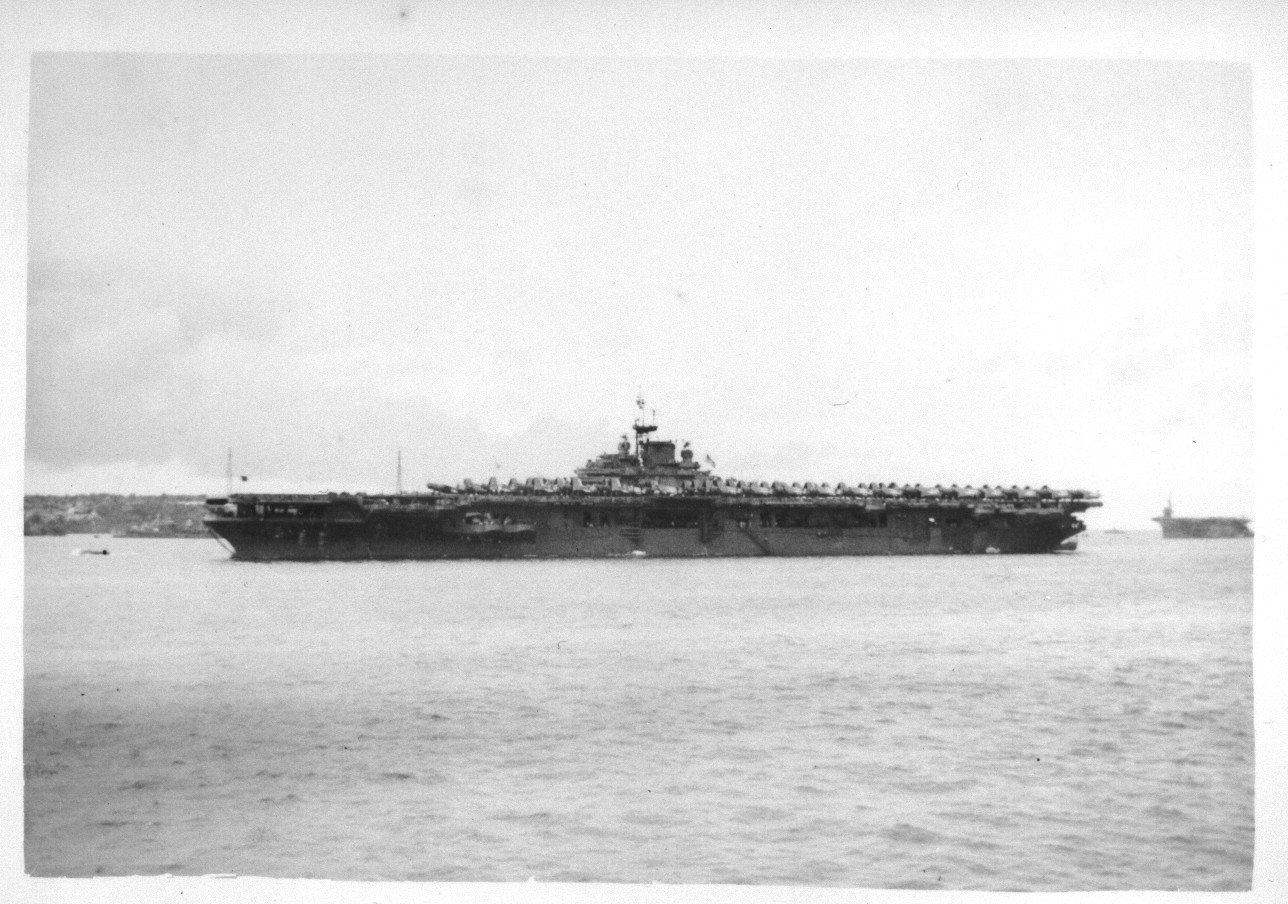 249k | USS Antietam (CV-36) at Guam in 1945 (October?). Photo taken from USS Hooper Island (ARG-17). |