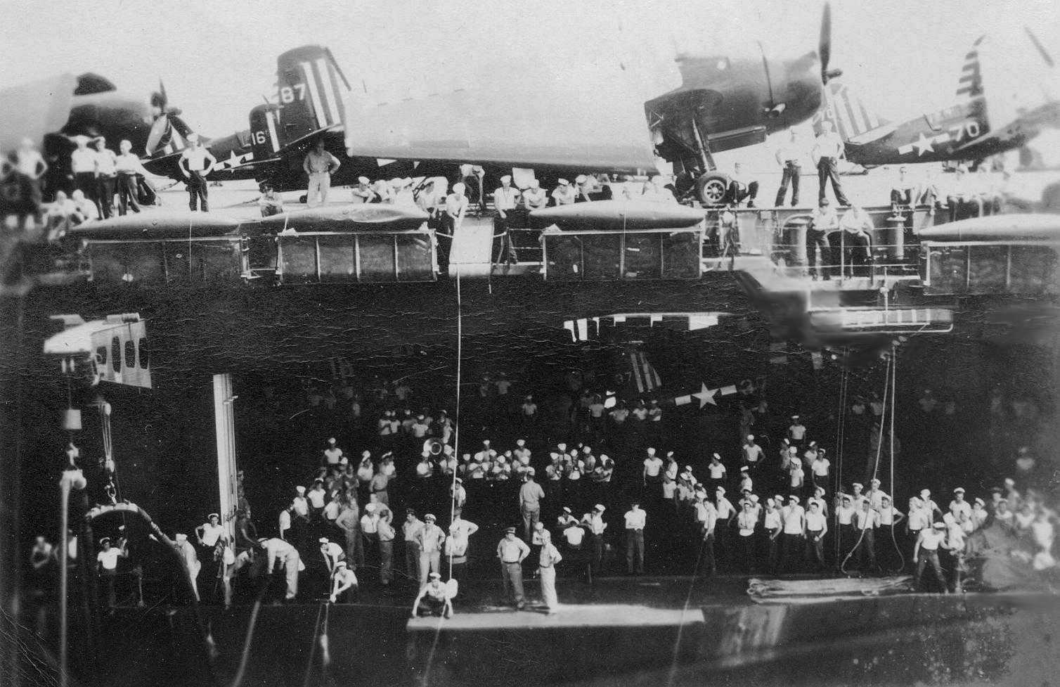 450k | Victory dinner aboard USS Antietam (CV-36) celebrating Japan's surrender, 22 August 1945. National Archives and Records Administration (NARA) photo, # 80-G-338366. |