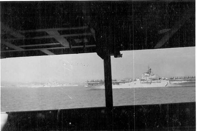 890k | USS Antietam (CV-36) just passed under the Golden Gate Bridge (Note shadow of the bridge's roadway). She is likely heading for Naval Air Station Alameda. Probably in October 1947. Courtesy of the Vallejo Naval and Historical Museum. |