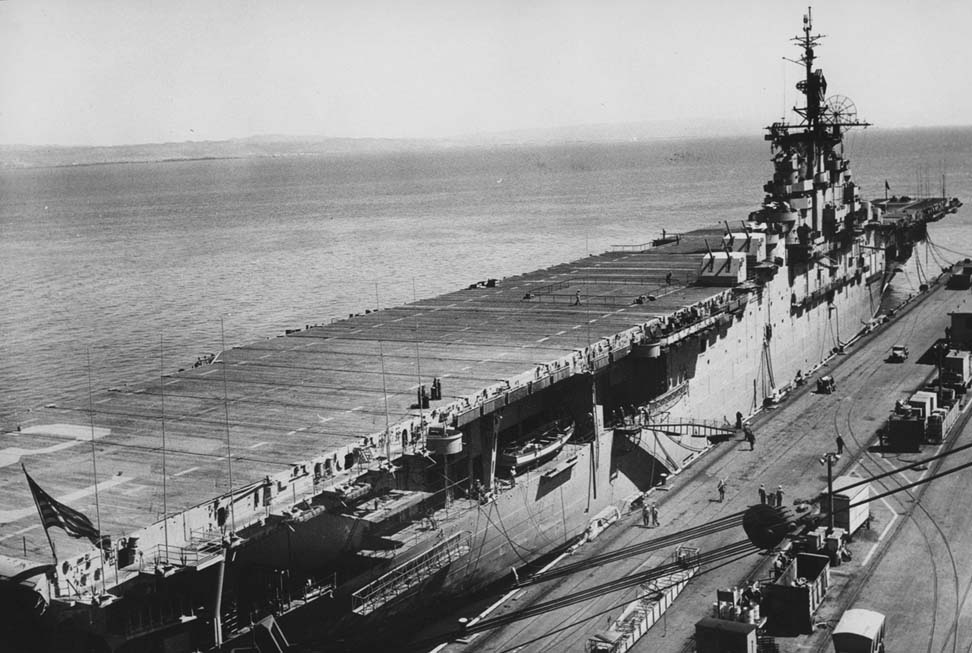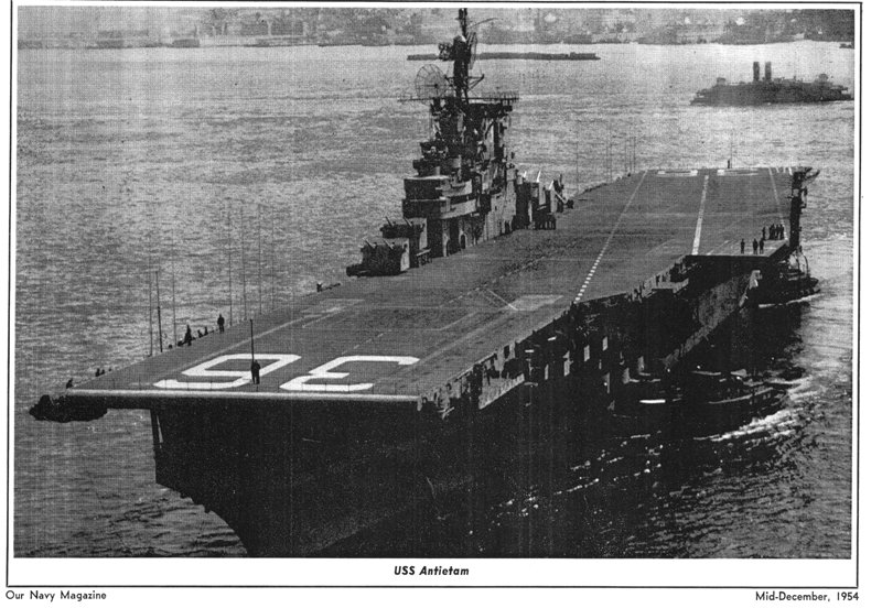 99k | Undated photo of Antietam at Hunters Point, San Francisco, in the early 1950s—at least before August 1952, when she left for the East Coast to receive her angle deck. It could be when she was reactivated for service in Korea. Source: San Francisco Naval Shipyard – Hunters Point, Historical Shipyard Photographic Collection 1904–74 NARA Pacific Region (San Francisco). |