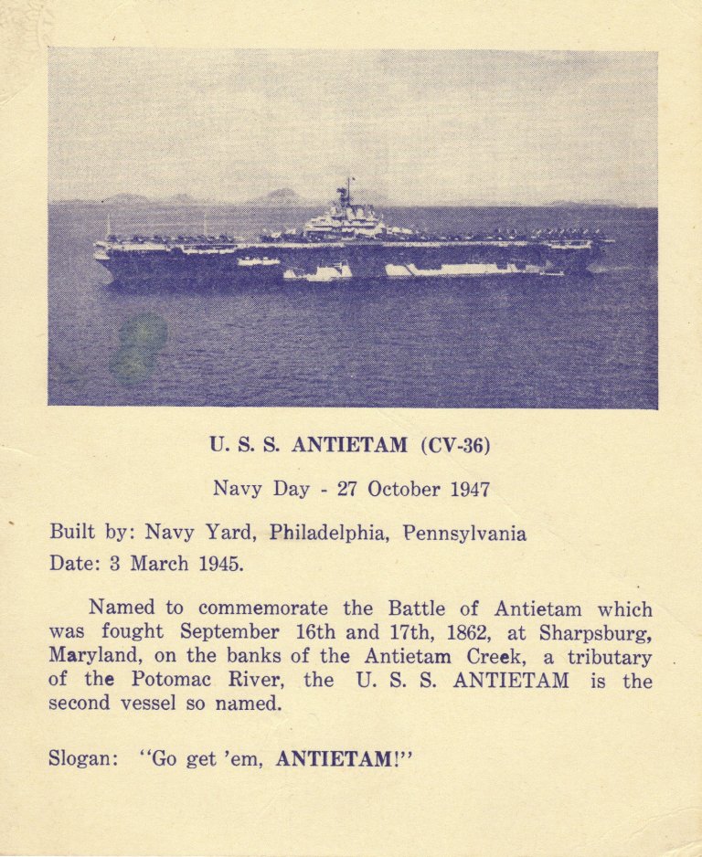 160k | Card that was passed out to visitors aboard USS Antietam (CV-36) on Navy Day, 27 October 1947. |