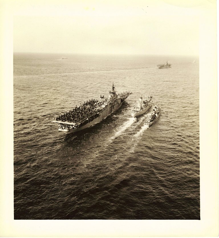 125k | USS Antietam (CV-36) alongside oiler USS Chiwawa (AO-68), 6 September 1945, operating off Korea in Task Force 72. This image shows the added structure on the starboard face of the island. From a USS Chiwawa web site. |