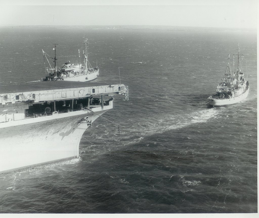 169k | Fleet ocean tug USS Luiseno (ATF-156), right, assisted by rescue and salvage ship USS Hoist (ARS-40), towed ex-USS Antietam from Quonset Point, RI, to Philadelphia, PA. Photos come from the Photographic Laboratory aboard the repair ship USS Cadmus (AR-14) and are dated 7 February 1969 (photo # AAF-2380-11-68). |