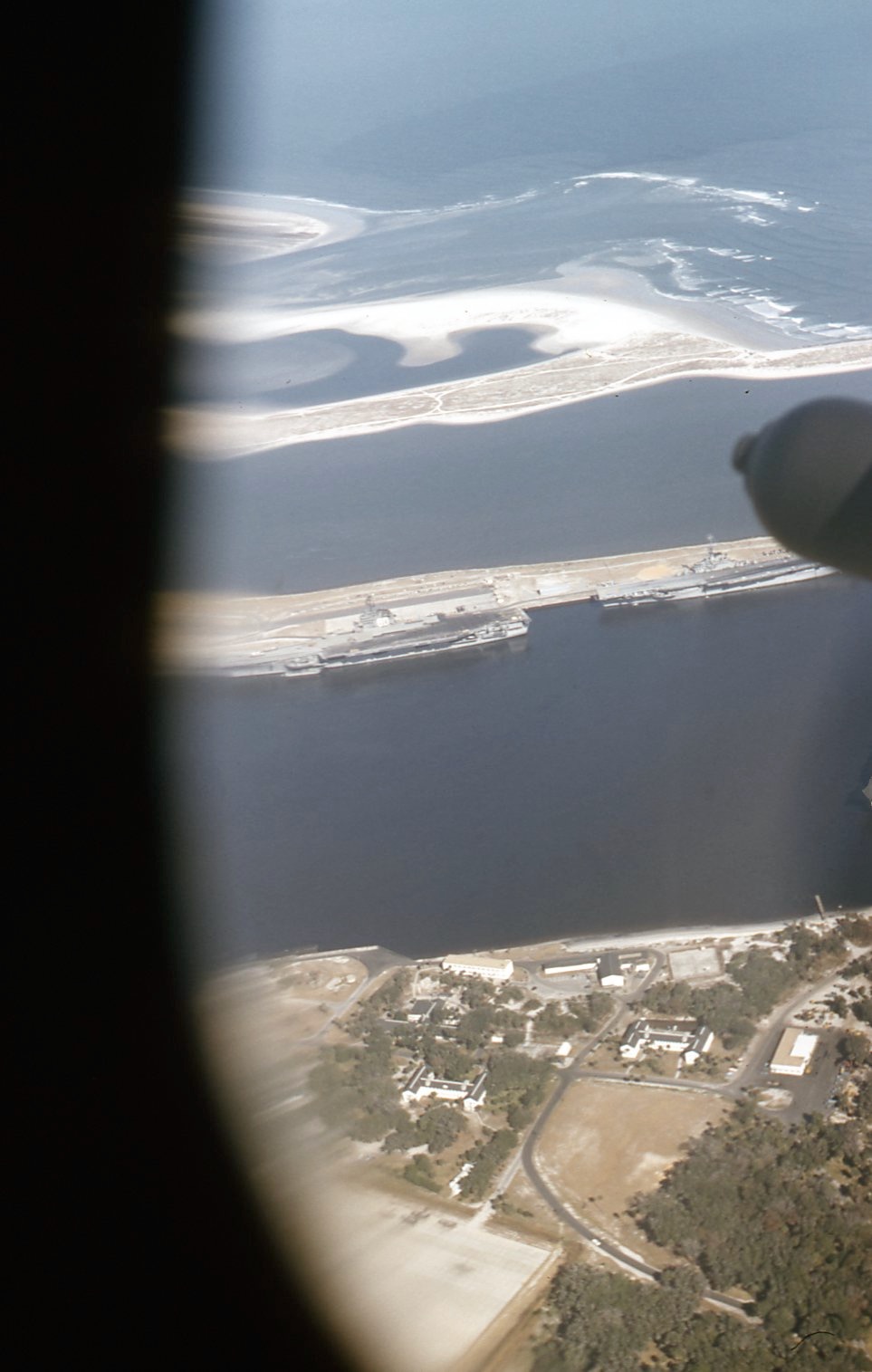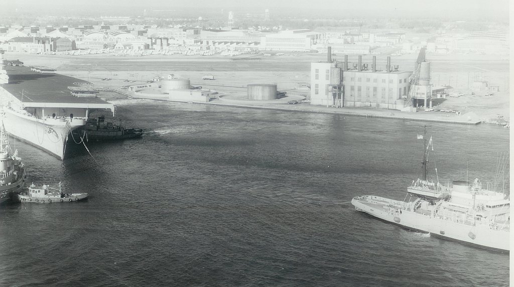 164k | Vertical aerial photograph of the Boston Naval Shipyard Annex, taken in May 1958. This print has been annotated to mark warehouses used by the U.S. Army. A large number of ships are present, among them twenty Reserve Fleet escort aircraft carriers. Identifiable ships are USS Norfolk (DL-1), at left at the end of the wharf extending from the drydock; USS Antietam (CVS-36), in lower left; and USS Dayton (CL-105), in right center, among the escort carriers. Official U.S. Navy Photograph, from the Collections of the Naval History & Heritage Command (# NH 94199). |