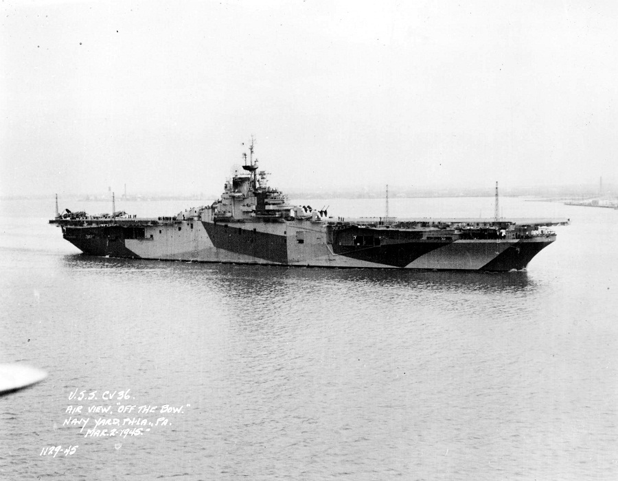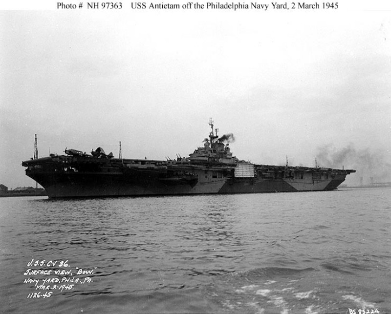 101k | USS Antietam (CV-36) off the Philadelphia Navy Yard, Pennsylvania, 2 March 1945. She is painted in camouflage Measure 32, Design 17a. Official U.S. Navy Photograph, from the collections of the Naval History & Heritage Command (# NH 97363). |
