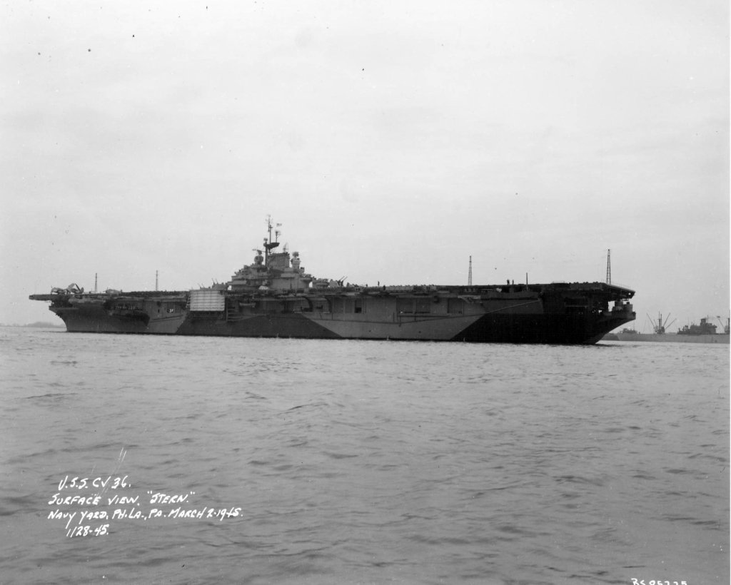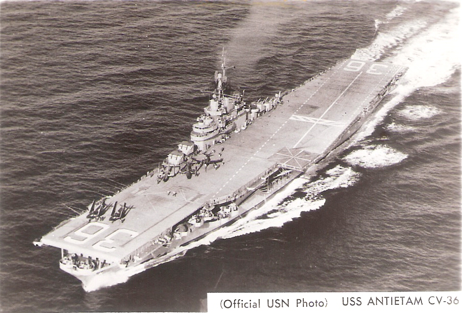 31k | USS Antietam (CV-36) anchored off Norfolk, VA, mid-July 1945. Source: Kitsap County Library System. |
