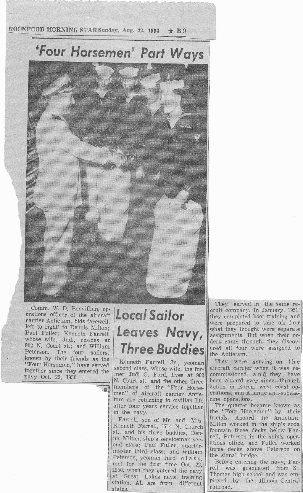 482k | "'Four Horsemen' Part Ways"—Dennis Milton, Paul Fuller, Kenneth Farrell and William Peterson, known as the Four Horsemen, were assigned to USS Antietam (CV-36) in 1951 and continued to serve aboard until they were honorably discharged from the Navy in 1954. When Antietam and USS Shangri-La (CV-38) swapped crews on 5 September 1952, the Four Horsemen were the only members of Antietam's crew who remained aboard CV-36. Newspaper clipping from the Rockford Morning Star, Sunday, 22 August 1954. |