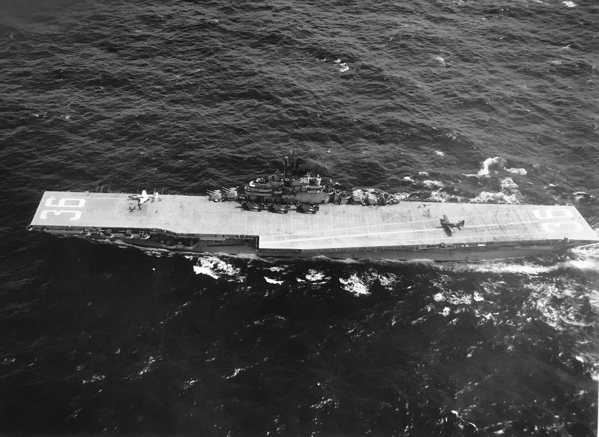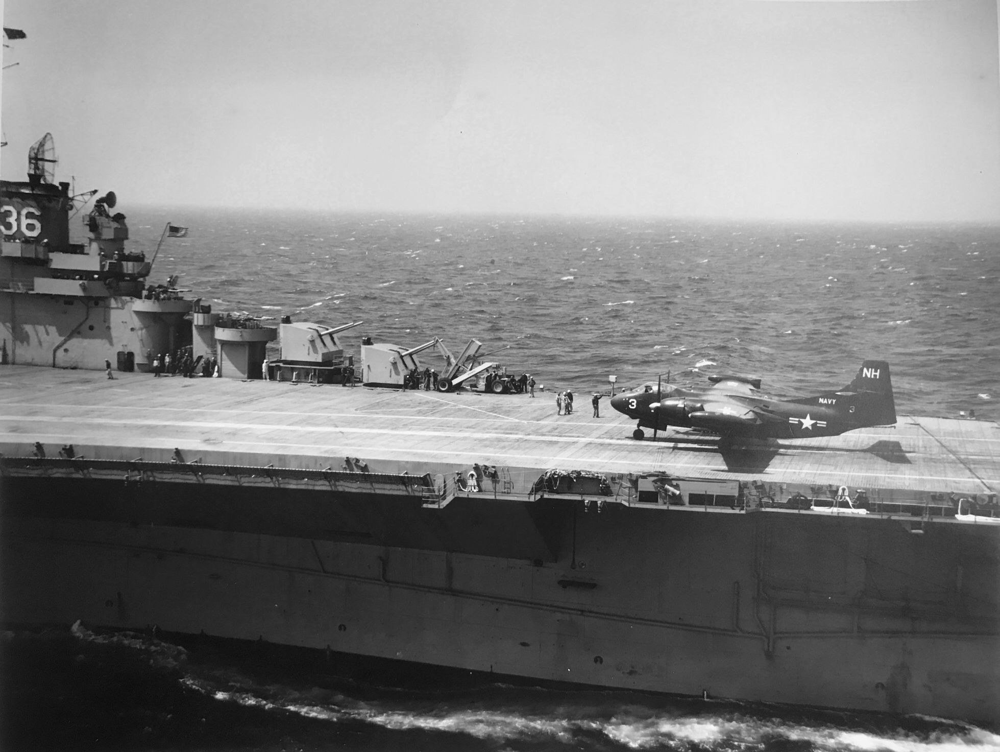 88k | USS Antietam (CV-36), Curtiss SB2C Helldiver aircraft on the carrier's flight deck, with officers and men on her island watching flight operations, circa 1946–47. The plane in the left foreground is an SB2C-5, Bureau # 83332. Official U.S. Navy Photograph, from the collections of the Naval History and Heritage Command, # NH 97366. |