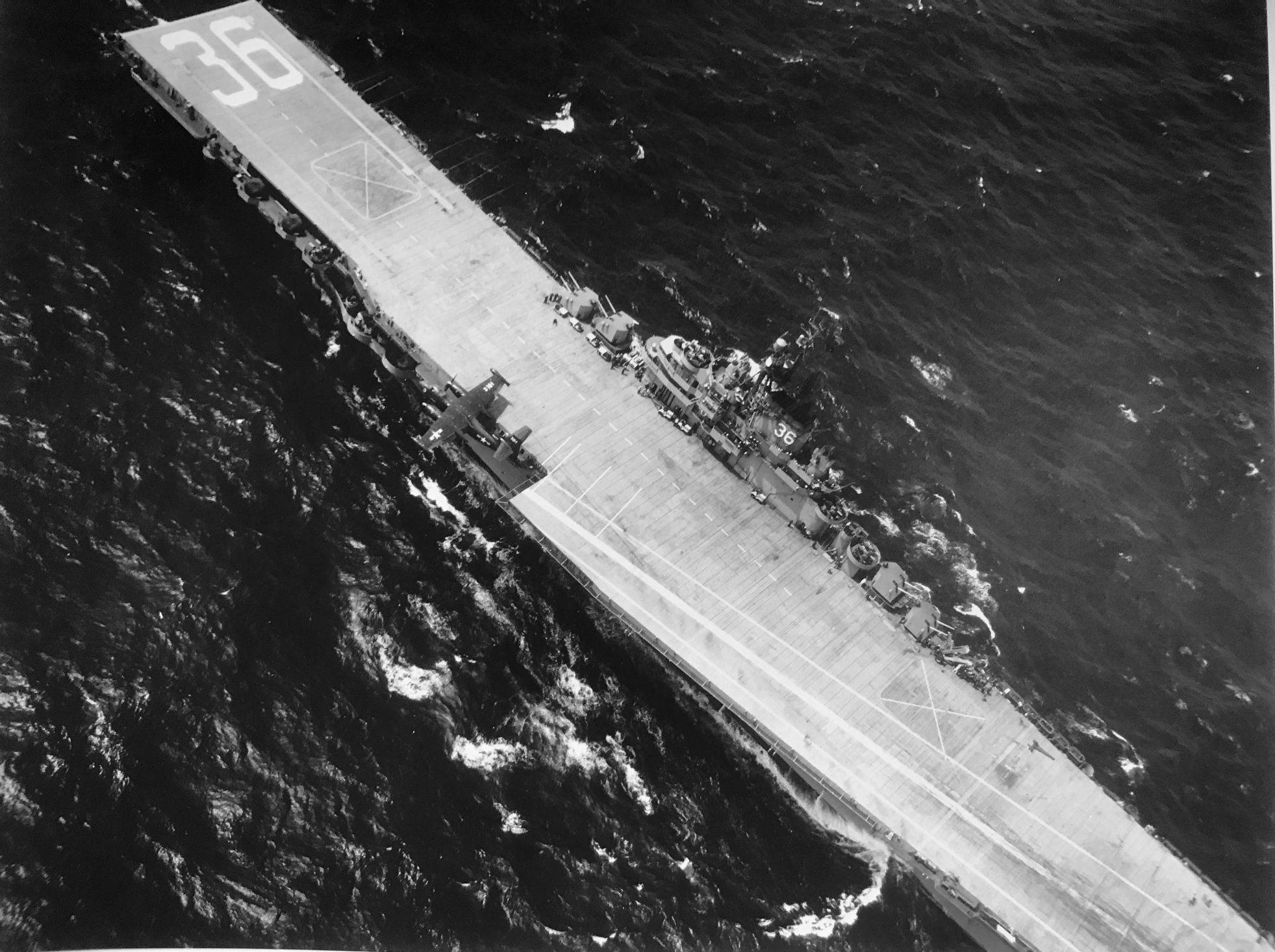 344k | A TBM-3E Avenger of Torpedo Squadron (VT) 95 in flight over USS Antietam (CV-36) off Hawaii, possibly in 1945. US Navy and Marine Corps Museum/Naval Aviation Museum, photo No. 1996.253.1559. Robert L. Lawson Photograph Collection. |
