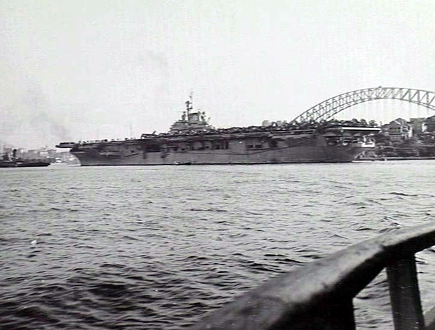 215k | Undated view of USS Antietam (CV-36) anchored at Sydney, NSW, Australia. Australian War Memorial, photo # 302540. |