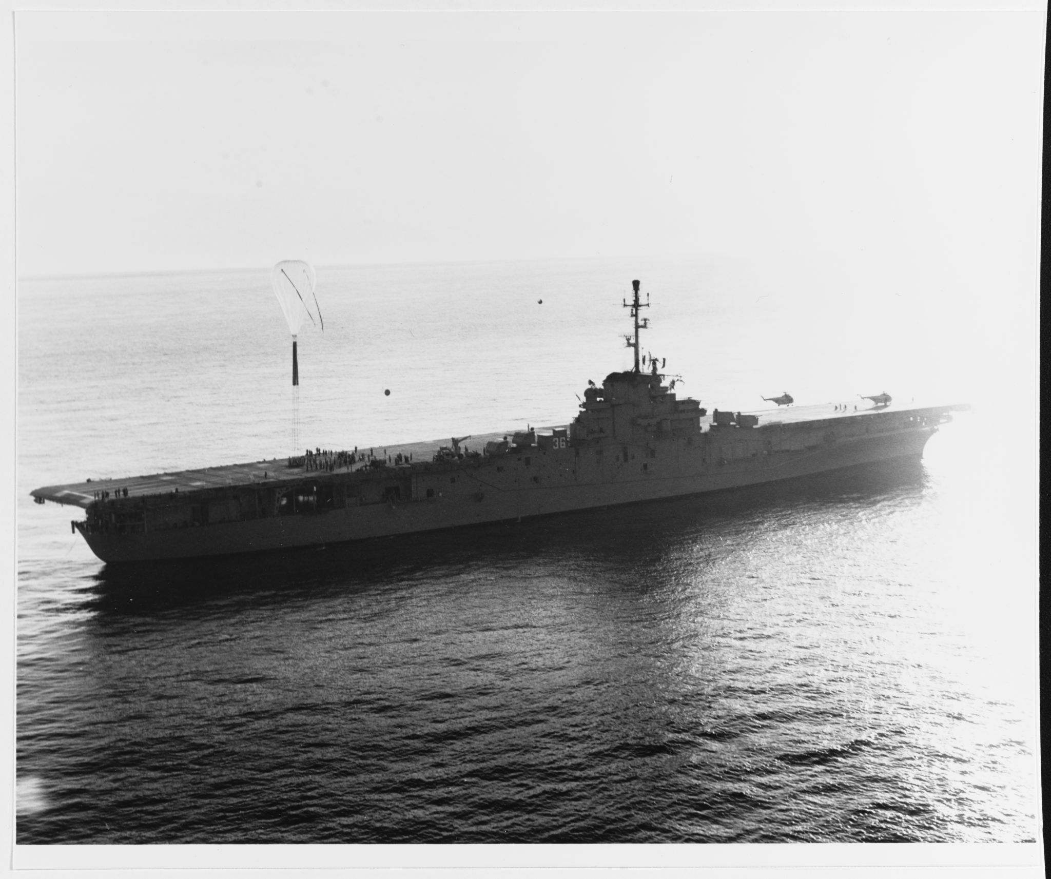 524k | USS Antietam (CVS-36) during Project Stratolab, 29 April 1961. The first manned balloon carrier landing is made. The balloon being hauled down to the flight deck, manned by Commander Malcolm D. Ross, USNR and flight surgeon Lieutenant Commander Victor A. Prather (MC) USN. National Archives and Records Administration (NARA) Photo, # 1054271. |