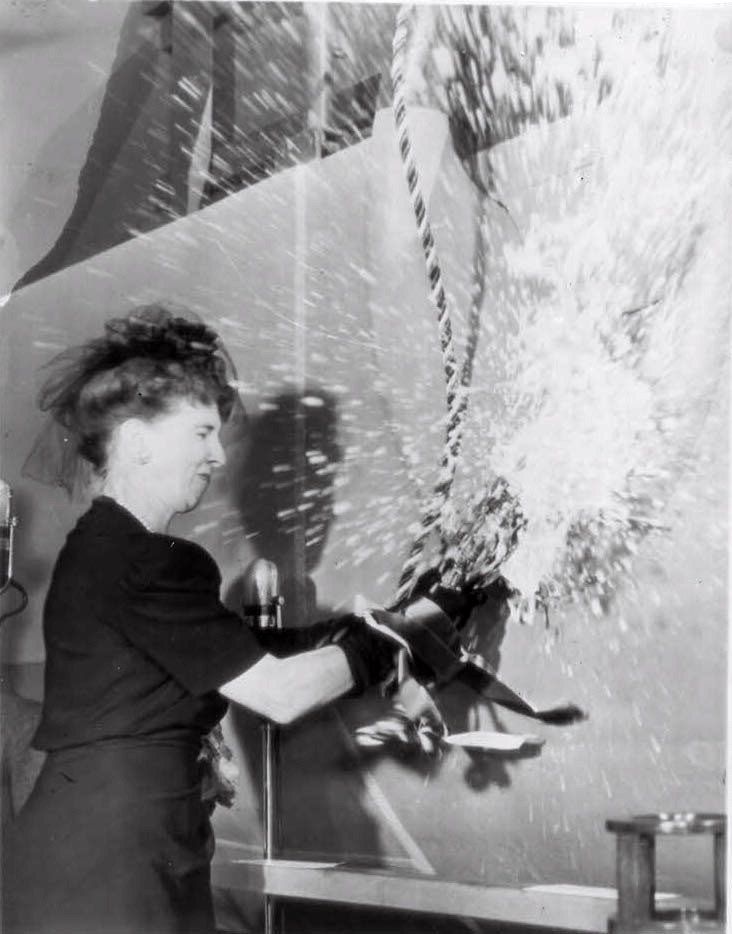 115k | Mrs. Eleanor Davies Tydings Ditzen, wife of Senator Millard Tydings, D-Md., christening Antietam (CV-36), Sunday, 20 August 1944. |