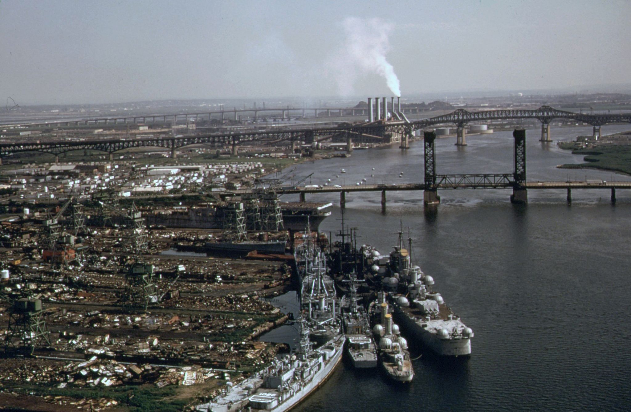 370k | NS023677: Former U.S. Navy ships awaiting scrapping by the Union Minerals and Alloys Corporation at the site of the former Federal Shipbuilding and Drydock Company, Kearny, New Jersey (USA), June 1974. The Lincoln Highway Hackensack River Bridge is just behind that with the Pulaski Skyway and Kearny Generating Station beyond. Identifiable in the foreground are:
