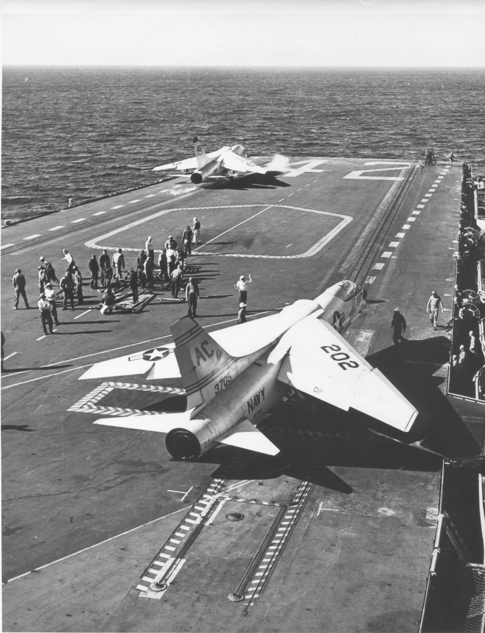 419k | USS Franklin D. Roosevelt (CV-42). Flight deck scene taken during her final deployment, 4 October 1976–21 April 1977. F-4N Phantom IIs from Fighter Squadron (VF) 51 "Screaming Eagles" and VF-111 "Sundowners," and A-7B Corsair IIs from Attack Squadron (VA) 153 "Blue Tail Flies," VA-215 "Barn Owls," and VA-155 "Silver Foxes," Carrier Air Wing (CVW) 19. All three attack squadrons were disestablished on 30 September 1977. |