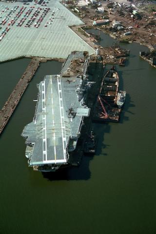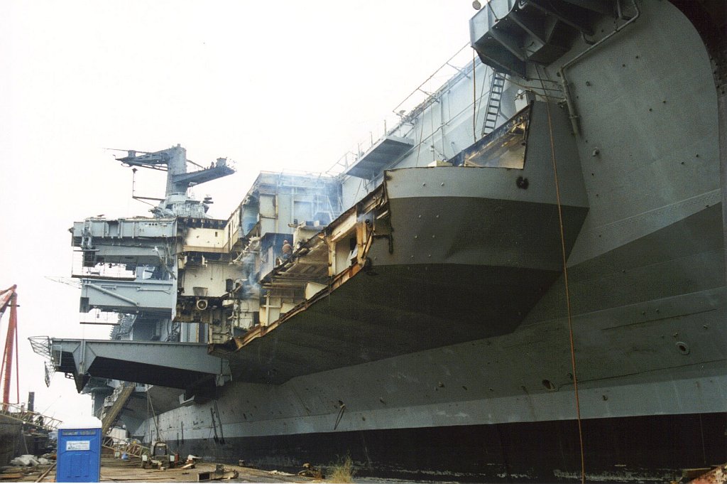 153k | September 20, 1993 — The structure outboard of the hull on the starboard side forward had been cut off; the very forward end of the flight deck had been removed; and a hole had been cut in the flight deck just aft of the catapult accumulators. Debris from this cut was strewn around the flight deck between the catapults and the island. |