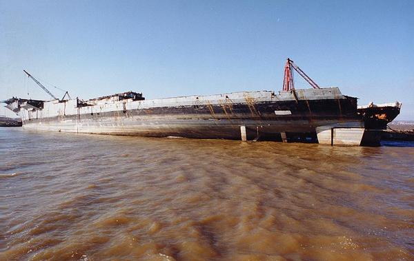 146k | August 13, 1993 — Ex-Coral Sea had arrived at Fairfield on July 5, 1993, and scrapping at this point was minimal: only a few "test cuttings" had been done. The mast parts seen on deck had been cut off in Norfolk. |
