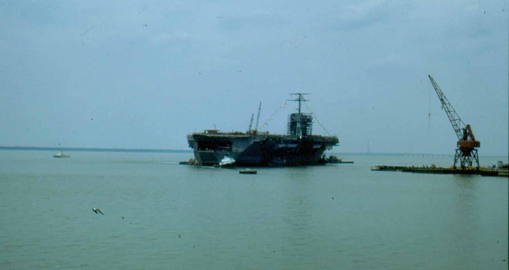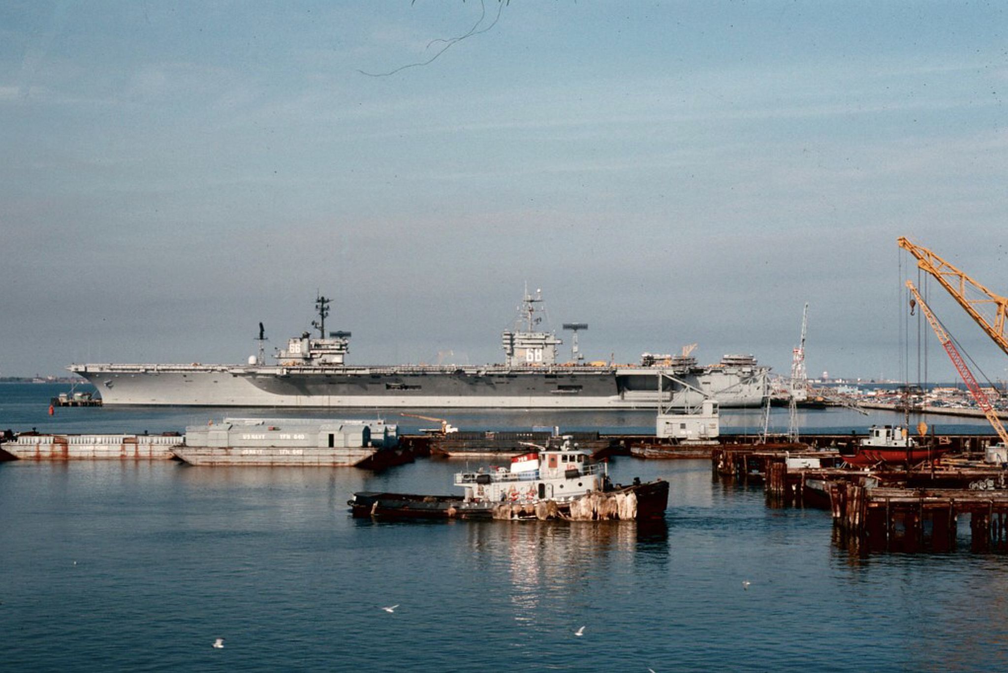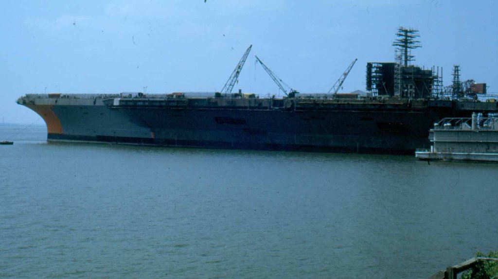 65k | Nimitz at the Newport News outfitting pier, probably in 1974. |