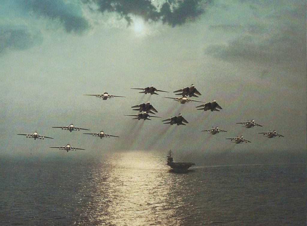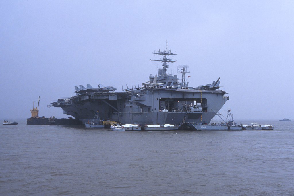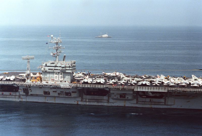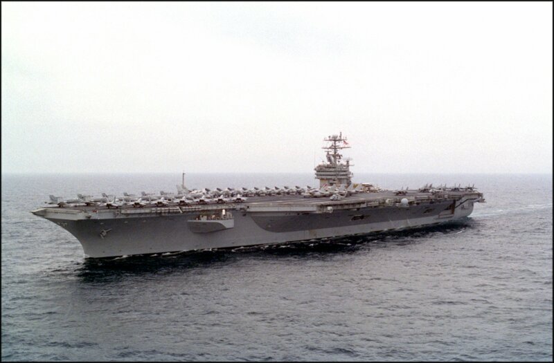 714k | USS Nimitz (CVN-68) underway in the Persian Gulf with Carrier Air Wing (CVW) 9, 23 March 1993, enforcing the no-fly zone against Iraq on the first day of Operation Southern Watch. US Navy photo by PH2 Tim Tow. Naval History & Heritage Command (NH&HC), photo # NH 106554-KN. |