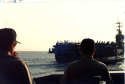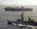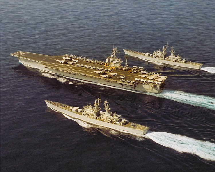 270k | December 15, 1997 The guided missile cruiser USS Port Royal (CG-73) and the submarine USS Annapolis (SSN-760) steam alongside the aircraft carrier USS Nimitz (CVN-68) as the sun rises on another day in the North Persian Gulf. U.S. Navy photo by Photographer's Mate 2nd Class Matthew J. Magee. [971215-N-9785M-462]. |