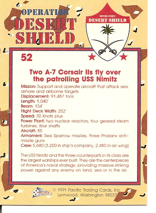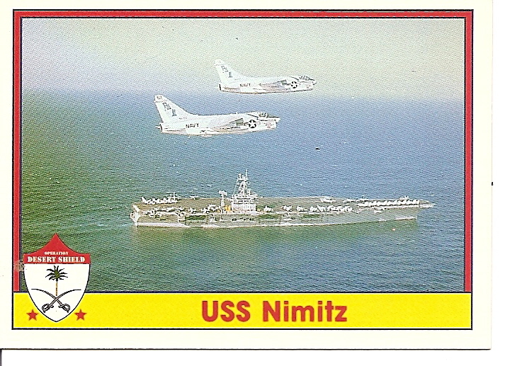 305k | USS Nimitz (CVN-68) and embarked Carrier Air Wing 9 (CVW-9) did not take part in Operations Desert Shield and Desert Storm, after Iraqi tanks and troops poured across the borders from Iraq into Kuwait in August 1990, but deployed to WestPac, the Indian Ocean and the Persian Gulf, 25 February–24 August 1991. (Note that CVW-9 did not include any A-7 Corsair II squadron.) |