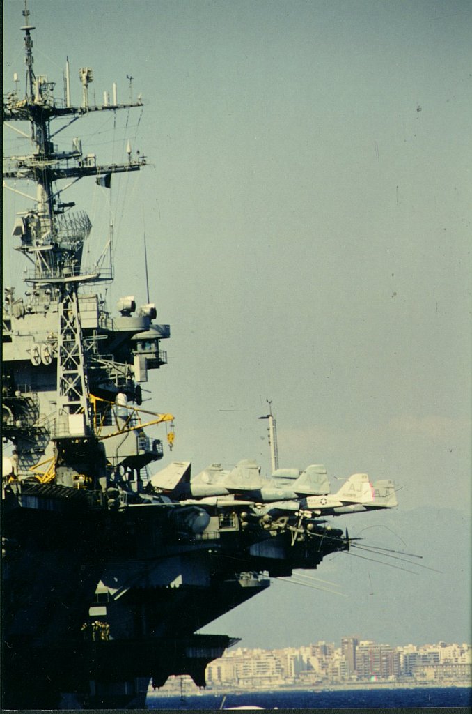 114k | USS Nimitz (CVN-68) at anchor off Palma de Mallorca, Balearic Islands, Spain, summer 1987(?). Air Wing was Carrier Air Wing (CVW) 8, tail code "AJ," made up of the following squadrons: