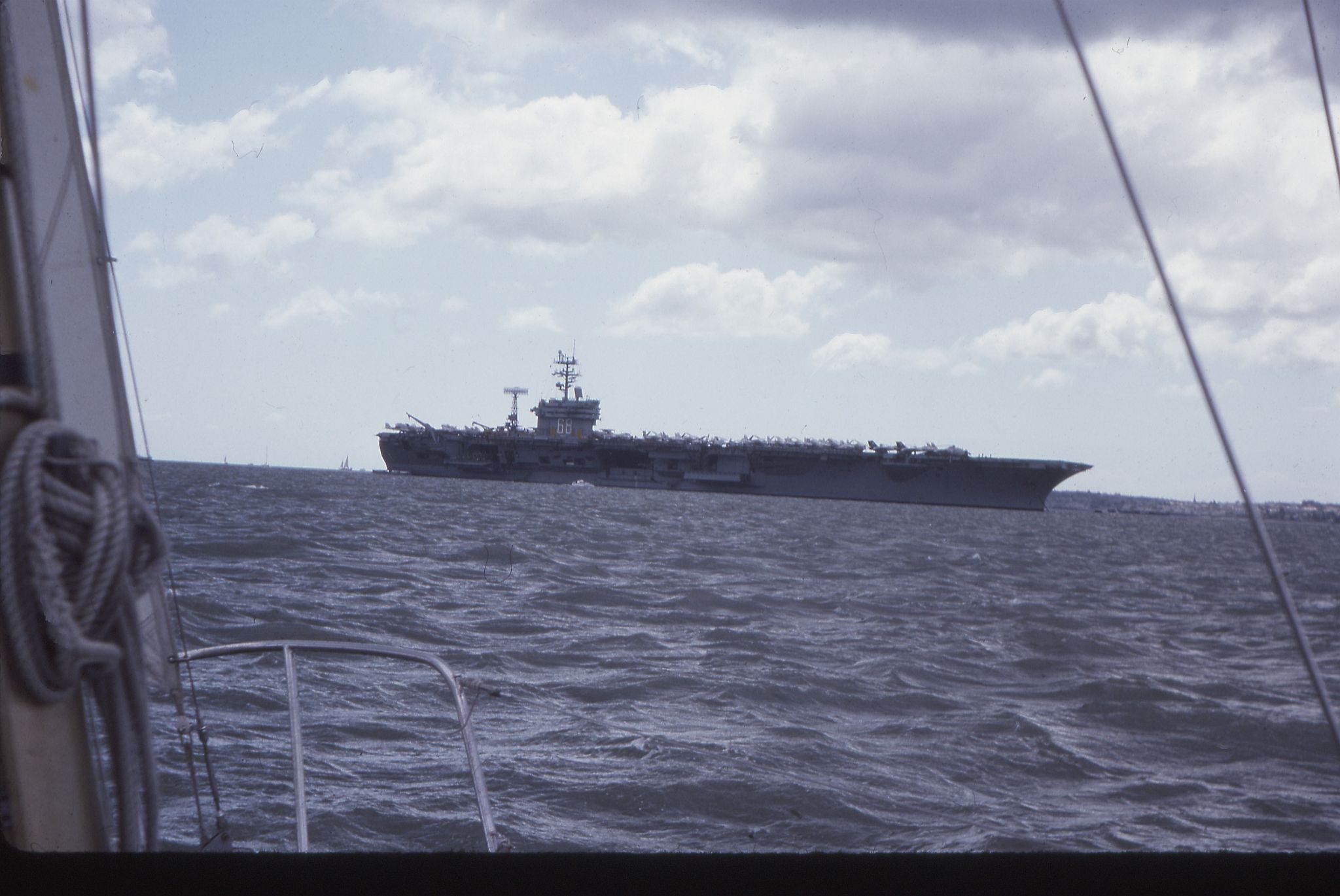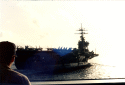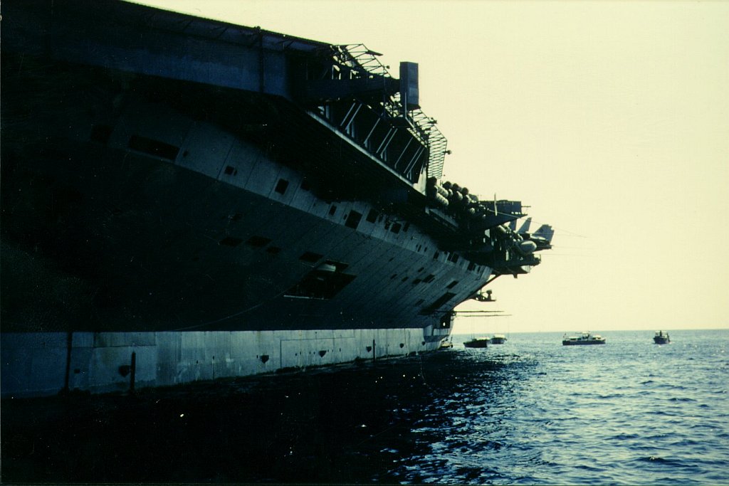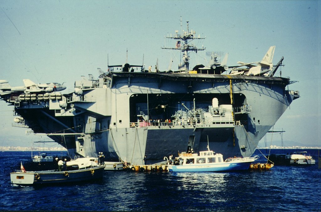 237k | USS Nimitz (CVN-68) at anchor (Augusta Bay, Italy?), 1987, during her East-to-West Coast deployment via Cape Horn. |