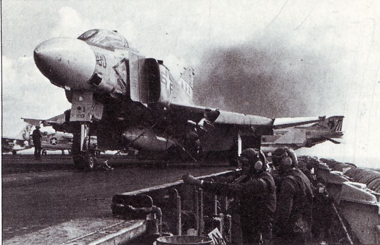 82k | Undated (probably 1976–77) picture of an F-4J Phantom II of Marine Fighter Attack Squadron (VMFA-333) "Shamrocks" on the cat aboard the nuclear-powered aircraft carrier USS Nimitz (CVN-68). US Navy photo. |