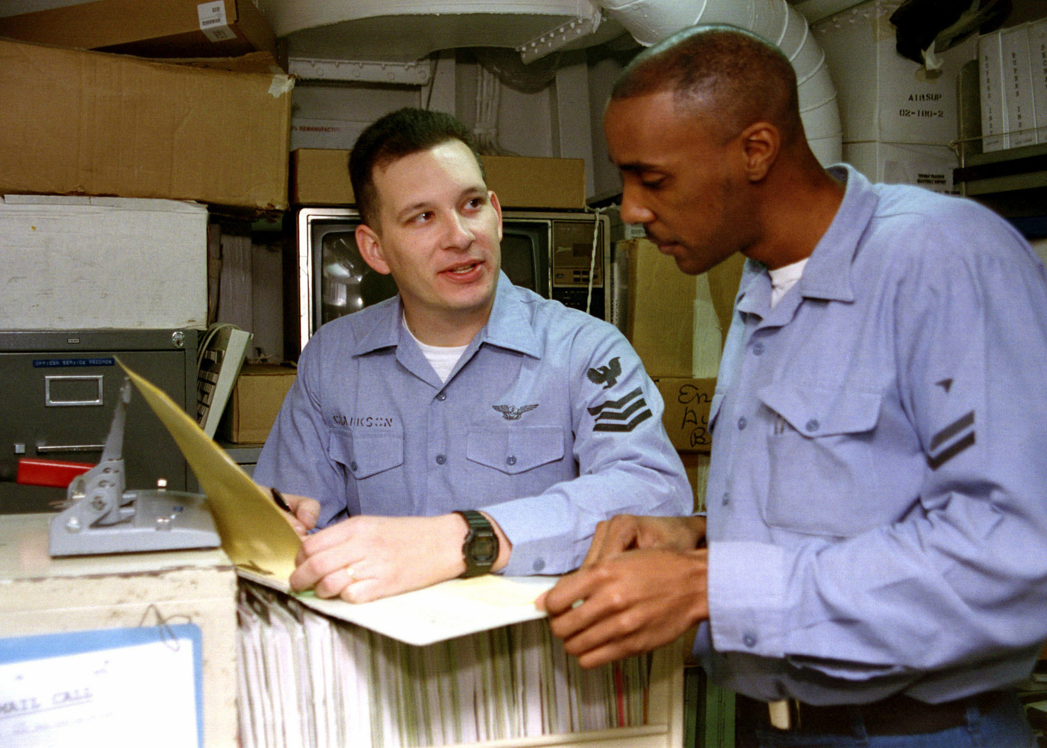 673k | Personnelman 1st Class (PN1) Jon D. Clarkson (left) instructs Yeoman 2nd Class (YO2) Kenya T. Delves on making service record entries during training aboard USS Nimitz (CVN-68), 8 January 1998. The nuclear-powered aircraft carrier was on station in the Persian Gulf in support of Operation Southern Watch. U.S. Navy photo by PH3 Michael L. Greene, USN, now in the collections of the National Archives and Records Administration (NARA), # 330-CFD-DN-SD-01-09008 and also # 980108-N-0970G-555. |