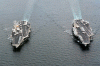 46k | The forward-deployed aircraft carriers USS Nimitz (CVN-68), left, and USS Independence (CV-62), center, perform an underway turn-over Sept. 25, 1997, while steaming off the coast of Japan. U.S. Navy photo by Photographer's Mate 2nd Class Chris Ware. [970925-N-4778W-117]. |