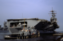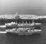 140k | An aerial port view of (fore to back) the guided missile destroyer USS Richard E. Byrd (DDG-23), the nuclear-powered aircraft carrier USS Nimitz (CVN-68), the replenishment oiler USS Kalamazoo (AOR-6), and the guided missile cruiser USS Josephus Daniels (CG-27) underway. The ships were part of Carrier Group Eight. Photo by PH1 R. Beno, February 5, 1987 available from the Defense Visual Information Distribution Service, id.: DN-SC-87-03840. |