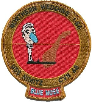 34k | Exercise Northern Wedding 86. USS Nimitz (CVN-68) crossed the Arctic Circle at 2138 on August 27, 1986 (position 66°33'N, 24º14'3"W), hence the "Blue Nose." |