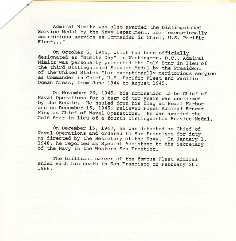 94k | Photo and biography of Fleet Admiral Chester W. Nimitz, from an Information Kit created by the ship's Public Affairs Office in 1976. |