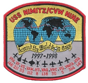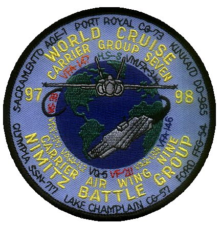 153k | World Cruise, 1 September 1997–1 1998. Carrier Group Seven, Carrier Air Wing Nine, Nimitz Battle Group Sacramento AOE-1, Port Royal CG-73, Kinkaid DD-965, Olympia SSN-717, Lake Champlain CG-57, Ford FFG-54 VS-33, VFA-147, HS-8, VMFA-314, VRC-30, VAW-112, VQ-5, VF-211, VAQ-138, VFA-146 |