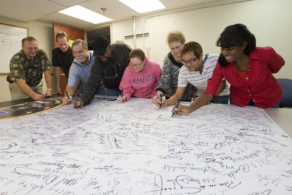 163k | Gerald R. Ford (CVN-78) program engineers (left to right) Bruce Cashwell, Bob O'Brien, Paul Bredlau, Arnold Williams, Jessie Zarkowski, Connie Holub, Jimmy Boonruang, and Jackie Tisdale, sign a 15-foot banner to signify the completion of the ship's keel unit. Photo by John Whalen (#7581). |