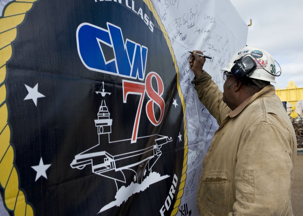 144k | John Knight, crane rigger, signs a 15-foot banner that would be on display at the Gerald R. Ford (CVN-78) keel laying ceremony on 14 November 2009. Photo by Ricky Thompson (#7582). |
